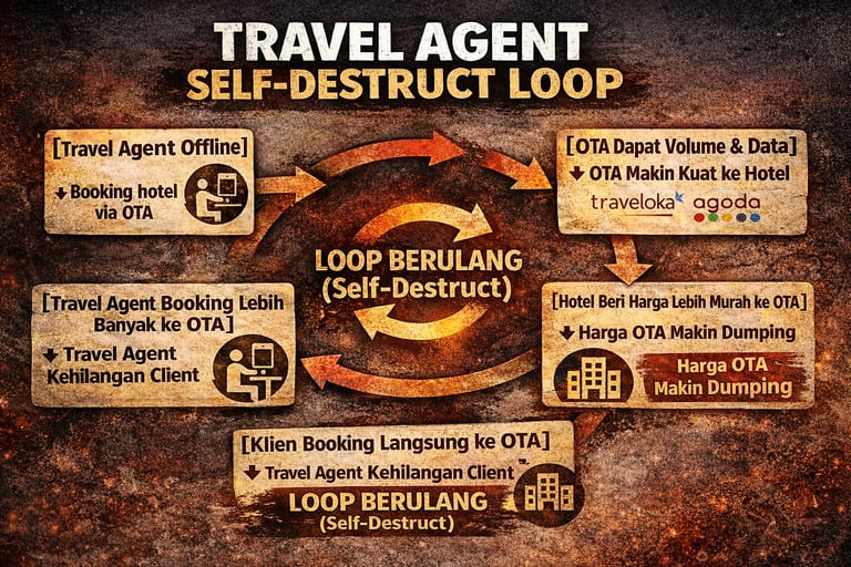 Ini adalah death spiral bisnis. Setiap transaksi yang masuk ke OTA B2C mempercepat kejatuhan travel agent itu sendiri.